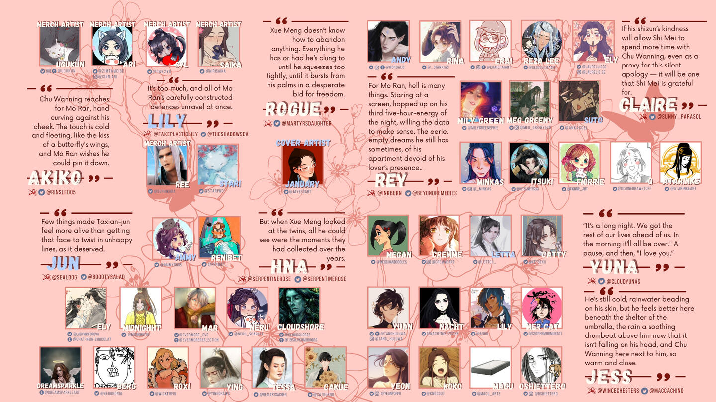 Des is new to zines but has run their own enamel pin shop @tiredlysighing for a few years now! They've made countless designs for various fandoms, including MXTX and ATLA. Though still reading 2HA, their favorite character is Xue Meng and their favorite scene so far is the confession!